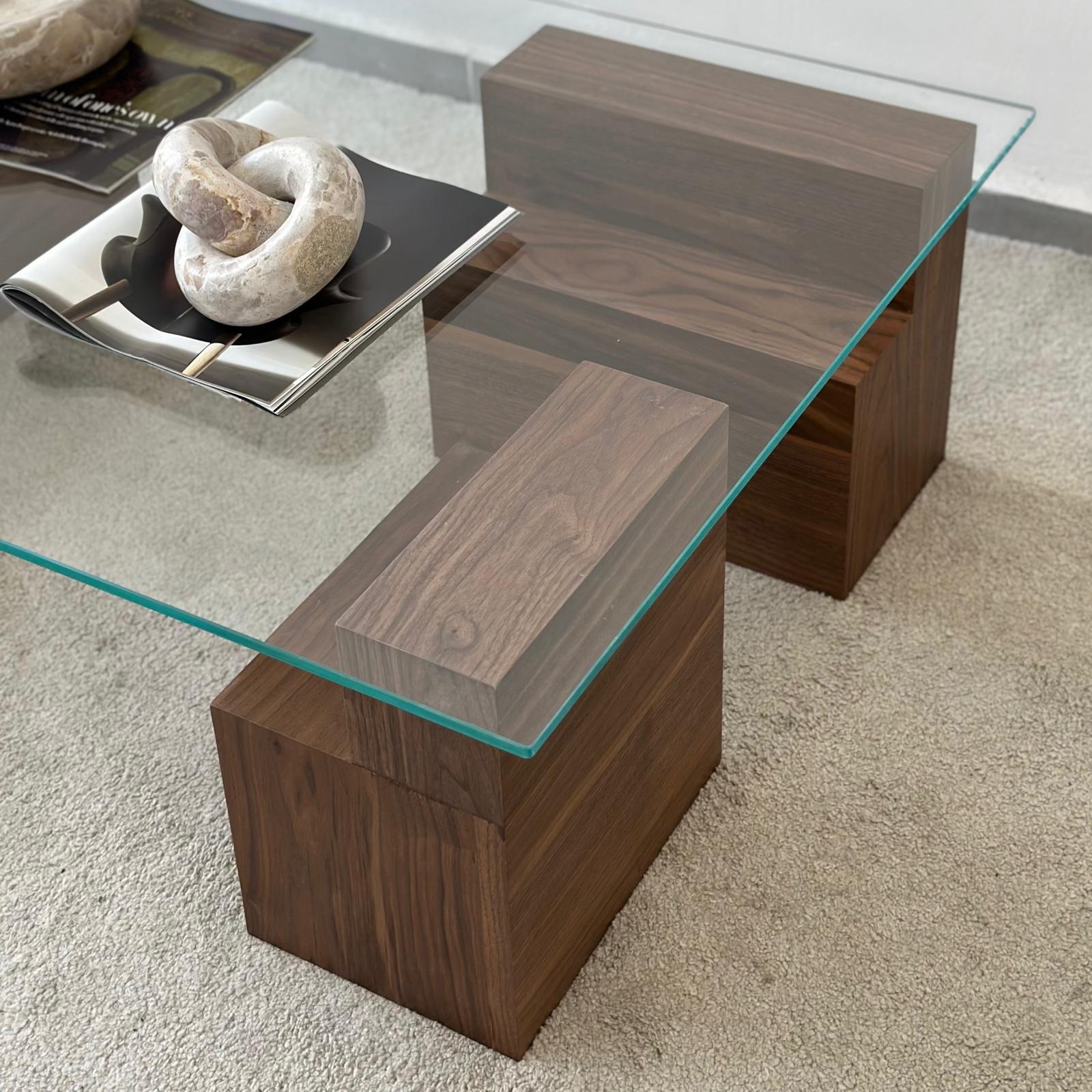 שולחן קאיה, עם פלטת זכוכית שיושבת על רגלי עץ אגוז בדוגמה גאומטרית מושלמת!