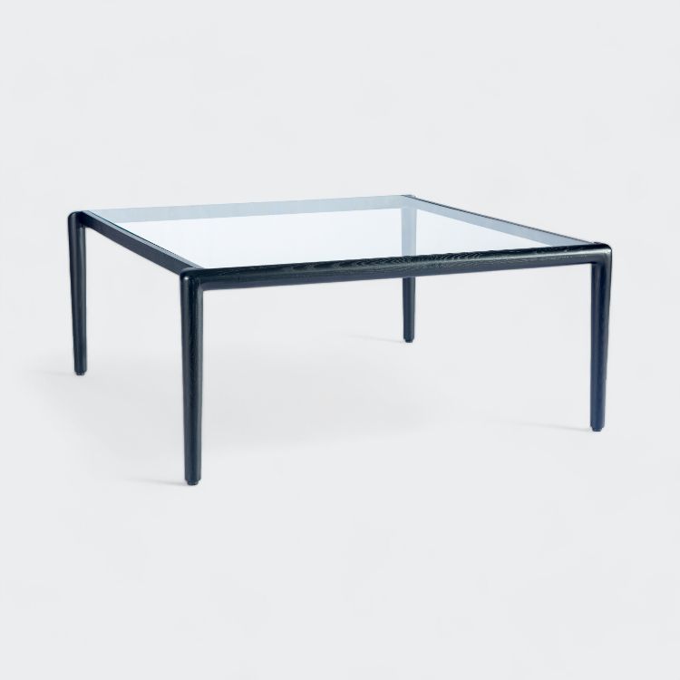 שולחן סלון מרובע בשילוב פלטת זכוכית ורגלי אלון מושחר למראה קלאסי ונקי