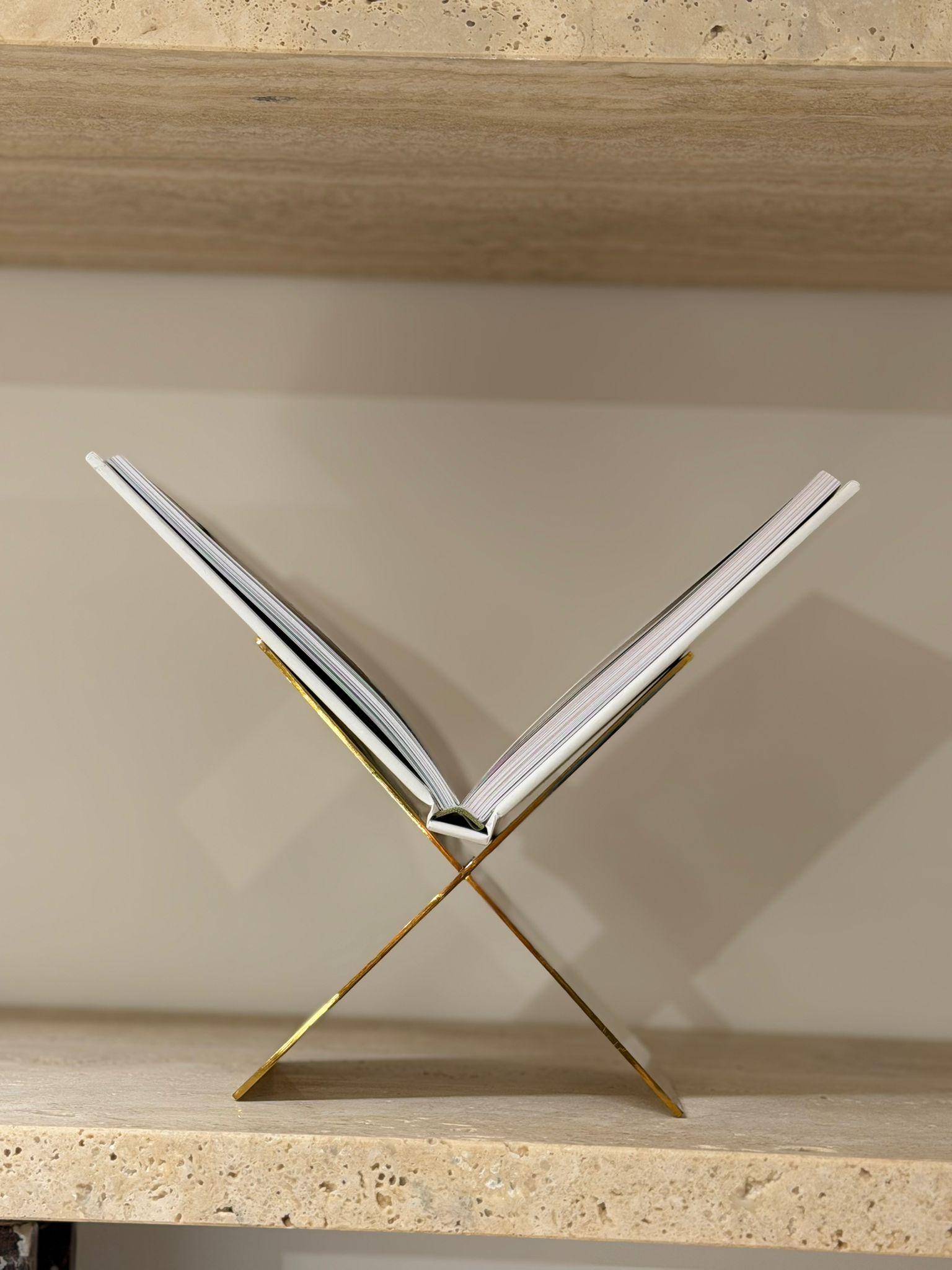 מעמד ספרים צר עשוי מתכת זהב סופר איכותית למראה עומד ויפה.